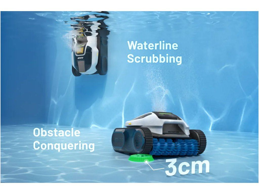 SPINO E1 využívá adaptivní technologii pohybu pro důkladné čištění mnoha typů bazénových povrchů – od dna přes stěny se sklonem až 110° až po odolné skvrny na hladinové lince.