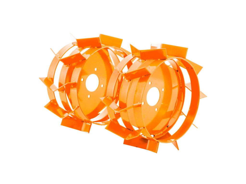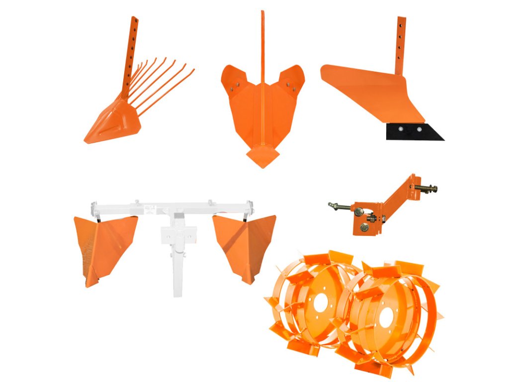 Set příslušenství obsahuje držák na nářadí, pluh, seřizovací pluh, vyorávač na brambory, 2x hrobkovací pluh použitelný s plečkou TS103, kovová kola bez poloos 400.