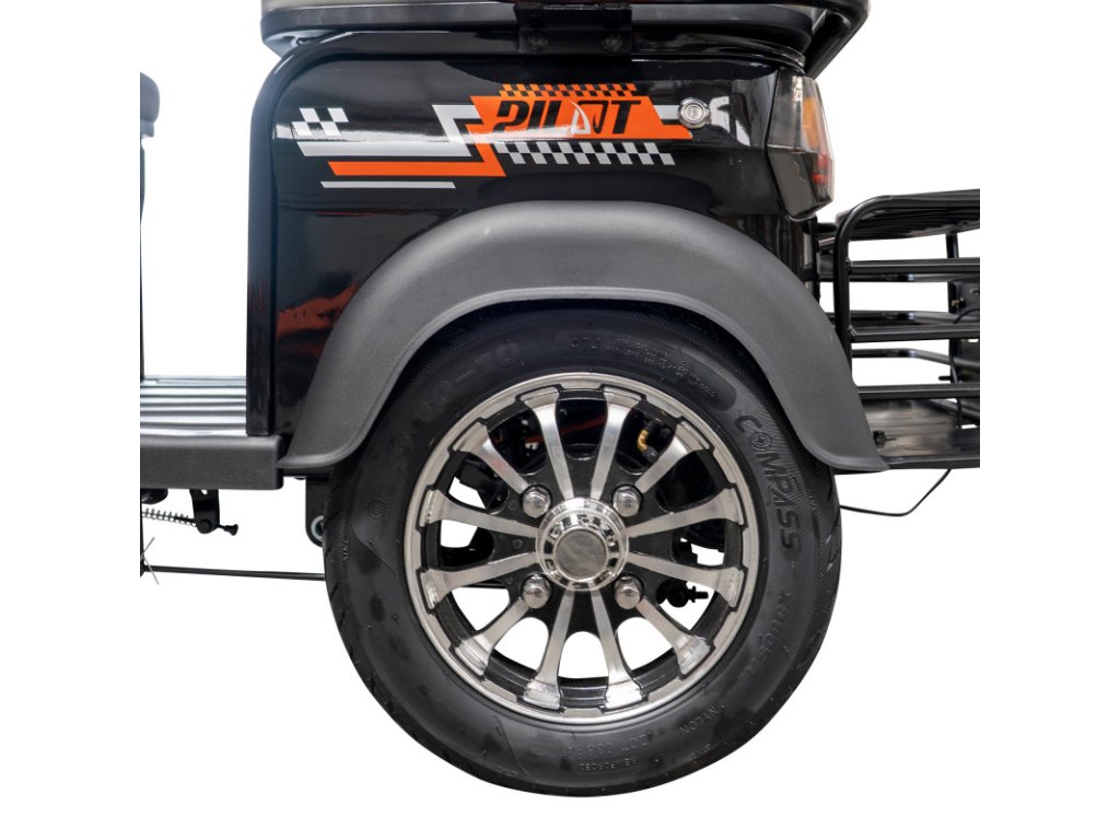 Elektrická tříkolka RURIS Pilot 3070A je vybavena kombinovaným brzdovým systémem, který zahrnuje přední kotoučovou brzdu a zadní bubnovou brzdu – tato konfigurace nabízí vynikající rovnováhu mezi bezpečností, účinností a odolností.
