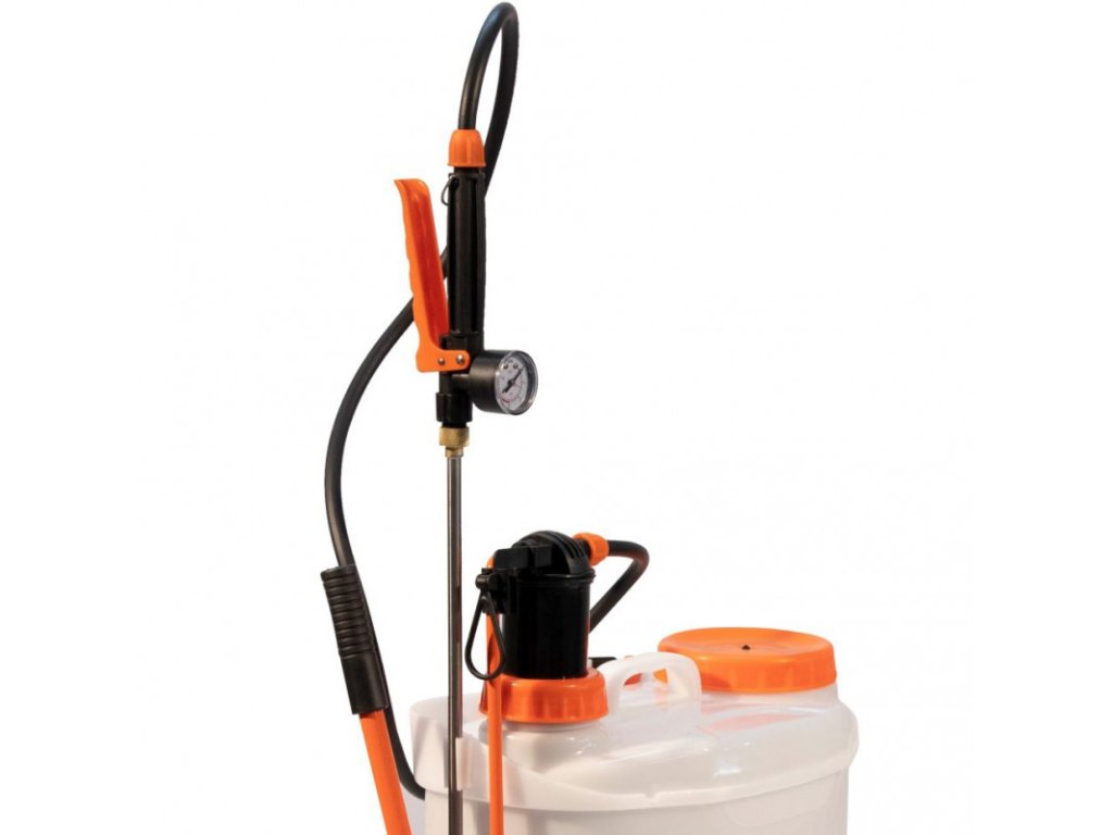 Profesionální postřikovač s vestavěnou baterií, jednoduchý na obsluhu, nabízí zvýšený komfort při používání. Odolné čerpadlo, teleskopická násada, velký plnící otvor, nádrž o objemu 20 litrů z odolného materiálu, 12 V baterie, která umožňuje používání postřikovače po dobu 4 hodin. Po vybití baterie lze postřikovač přepnout do manuálního režimu. Stav nabití baterie a zapnutí/vypnutí jsou monitorovány a kontrolovány elektronicky.