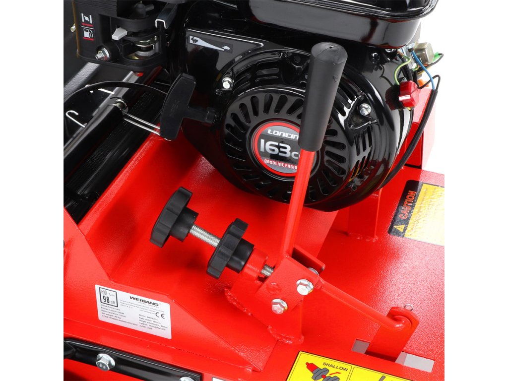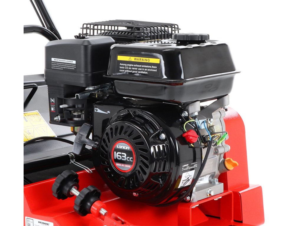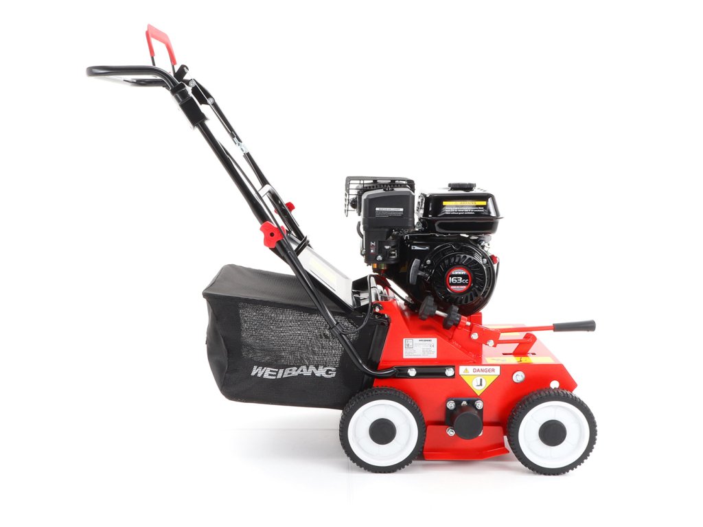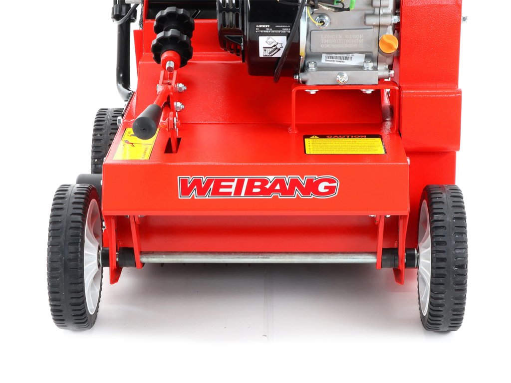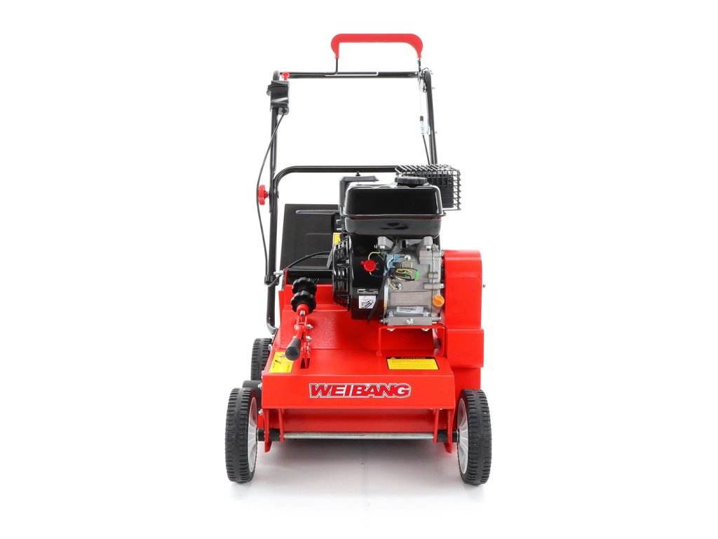 Motorový provzdušňovač trávníků WEIBANG 384 RC s motorem Loncin OHV 163 ccm, 5Hp, šířka pracovního záběru je 380 mm, plynulé centrální nastavením výšky, robusní šasi z vysokojakostní oceli, sběrný koš o objemu 40l. Hřídel je osazena 22 profesionálními flexi noži - tato konstrukce eliminuje možné poškození nožů nebo celé hřídele. Hřídel je uložena v masivních ložiscích. Hmotnost provzdušňovače je 46 kg.