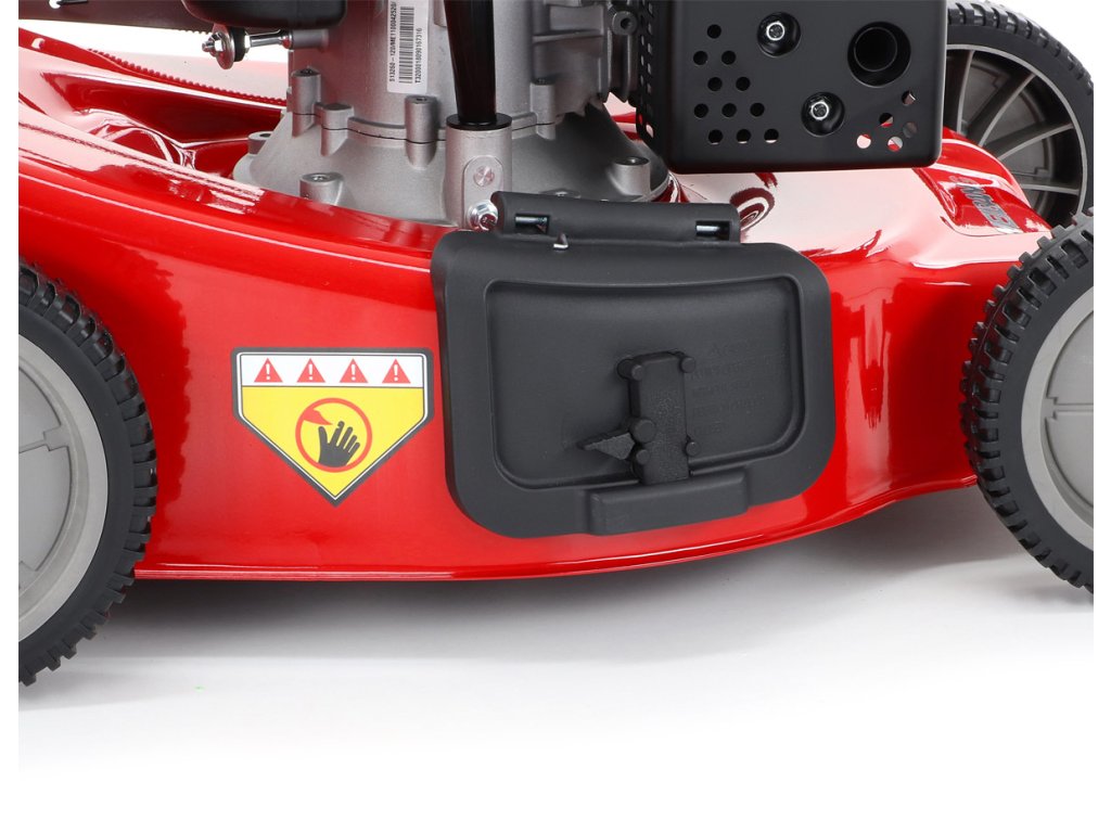 zadním deflektorem a má variabilní pojezd daný 3 rychlostní variátorovou převodovkou. Výhoda silného motoru o výkonu 6 HP a nože s velkými lopatami Vám perfektně sebere i přerostlou mokrou trávu. Pogumovaná sendvičová kola jsou uložena v oboustranných kuličkových ložiscích,