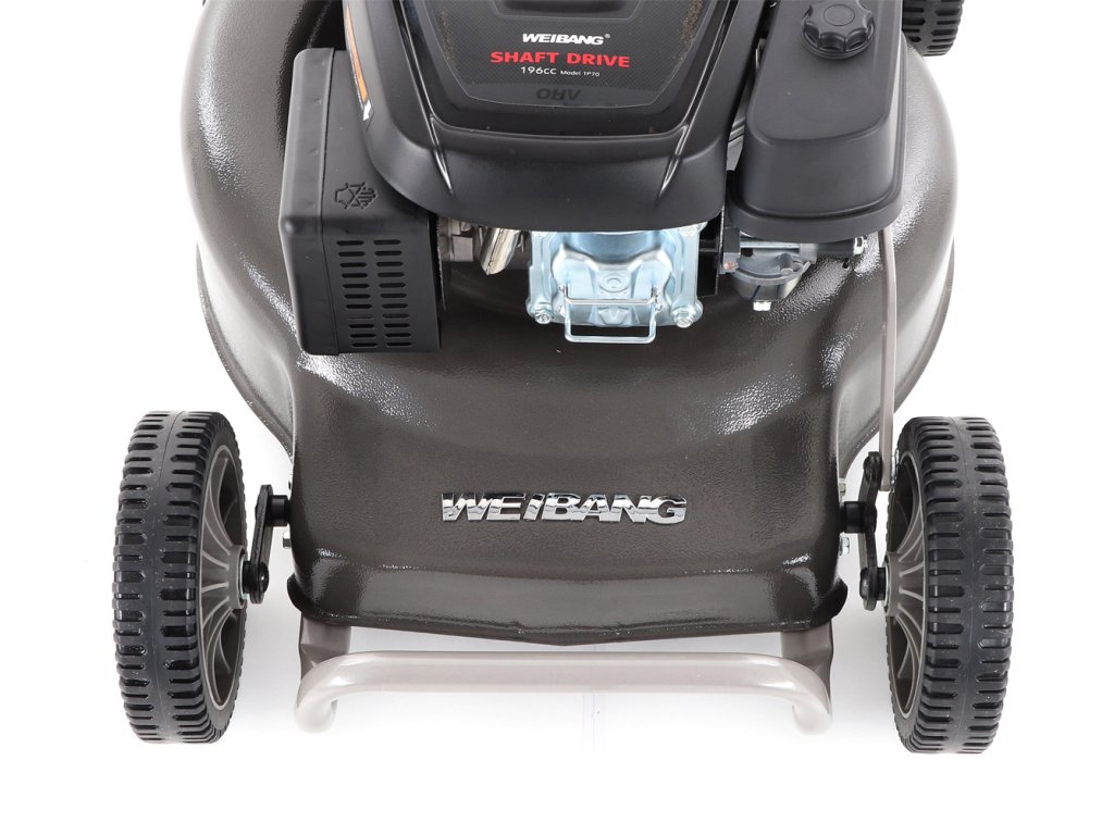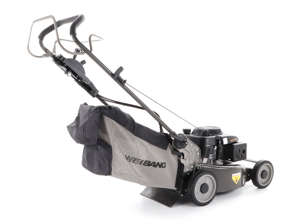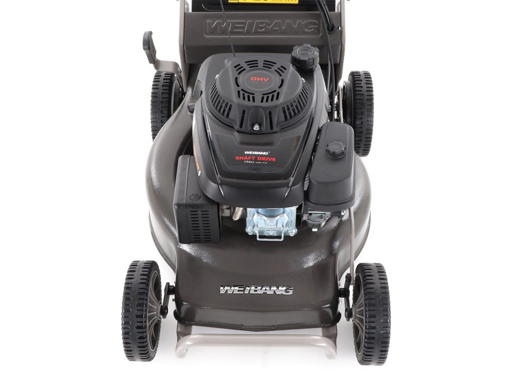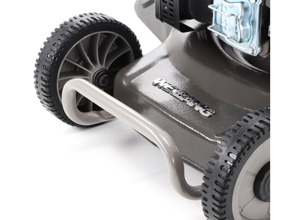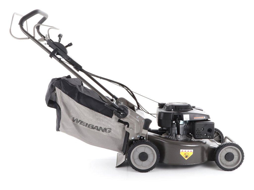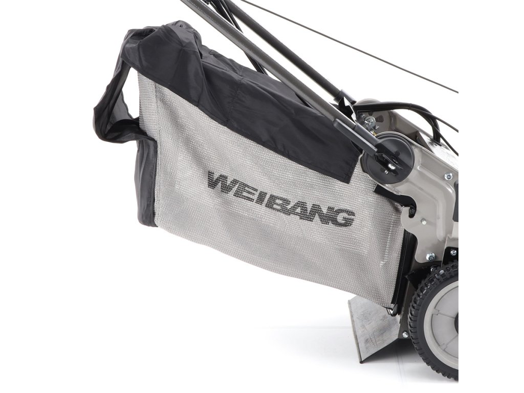 Dále je tato sekačka vybavena pevnými zadními koly a sklopnou rukojetí pro snadné uskladnění a přepravu. Masivní žačí nůž s mohutnými vyhazovacími "lopatami - tzv. BIG BLADE" a velký koš spolu se zajímavou cenou dělají z této sekačky WEIBANG WB 507 SCV kvalitního pomocníka s bojem proti zelenému živlu v běžném i profesionální težkém nasazení. Dalším velkým unikátem je motor, který patří mezi to nejlepší co výrobce WEIBANG v této třídě nabízí. Jedná se o profesionální silný motor rozvodu OHV o výkonu 7 HPa vysokým kroutícím momentem 10,5 Nm. Velkou výhodou této sekačky WEIBANG WB 507 SCV je řešení pojezdu za pomocí hřídelového kardanového pohonu. Jedná se o unikátní bezztrátovou technologii pojezdu, bez použití klínového řemene.