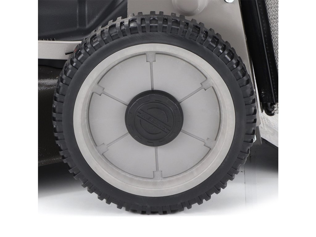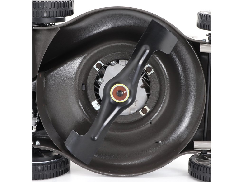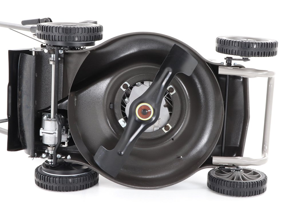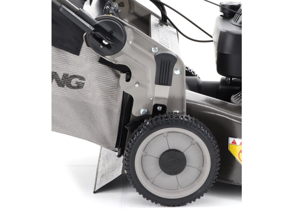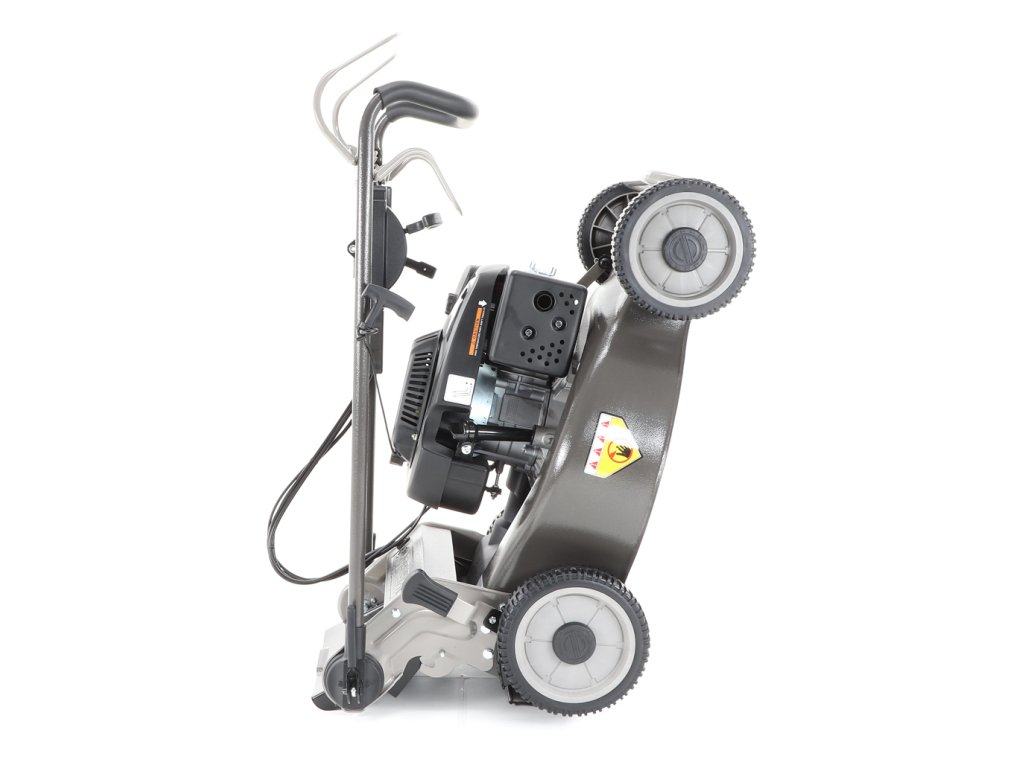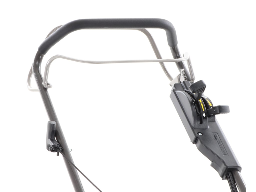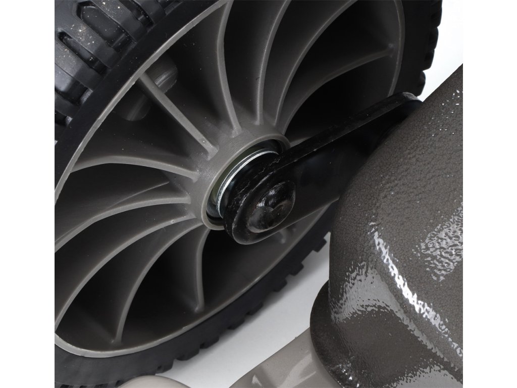 Pogumovaná sendvičová kola jsou uložena v oboustranných kuličkových ložiscích, centrální nastavení výšky sečení je u této značky samozřejmostí. Velkým nadstandardem u této sekačky je použita speciální třecí spojka na noži sekačky pod unášečem, která je schopna prokluzu nože při naražení do pevné překážky. Tato funkce může eliminovat škody na sekačce způsobené nárazem nože do překážky. Ergonomická rukojeť s ovládacími prvky otáček motoru a speciální povlak na obvodu sběracího koše,který stimuluje proud vzduchu, aby se neprášilo na obsluhu.