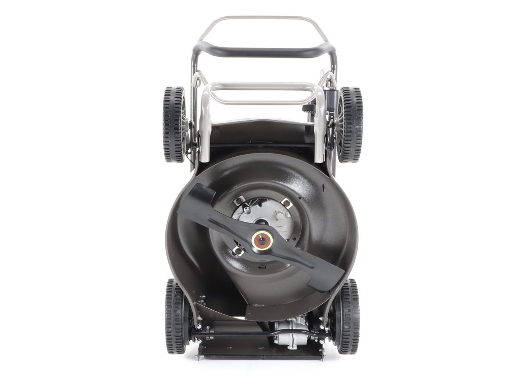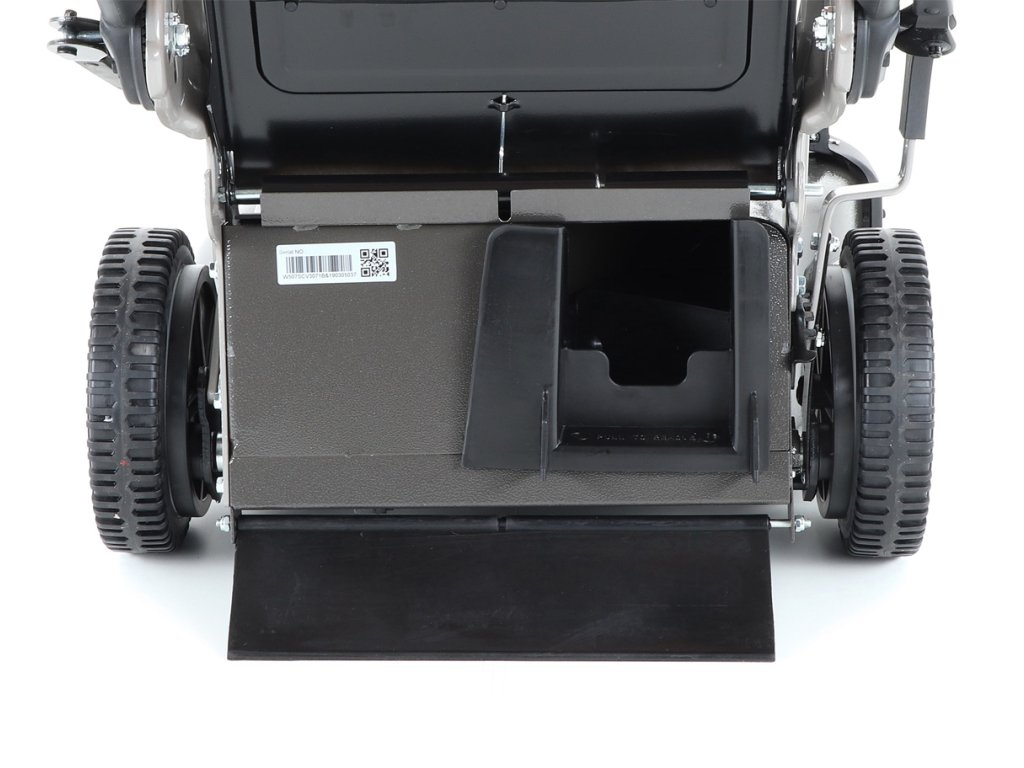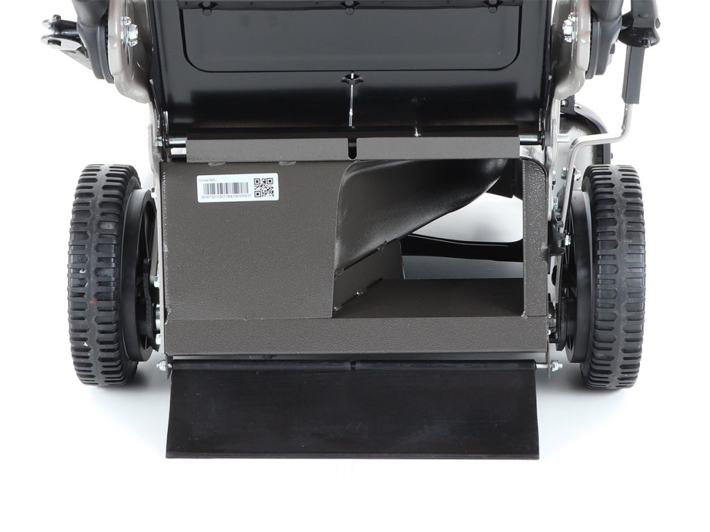 Novinkou sekačky je funkce tzv. "CHYTRÉ ŘEŠENÍ", sekačku lze pro ekonomické uskladnění, snadné čištění, servisování otočit a postavit na zadní speciální patky šasí, tímto se snadno dostanete na spodní část žacího ústrojí, uložení náprav a převodovku.