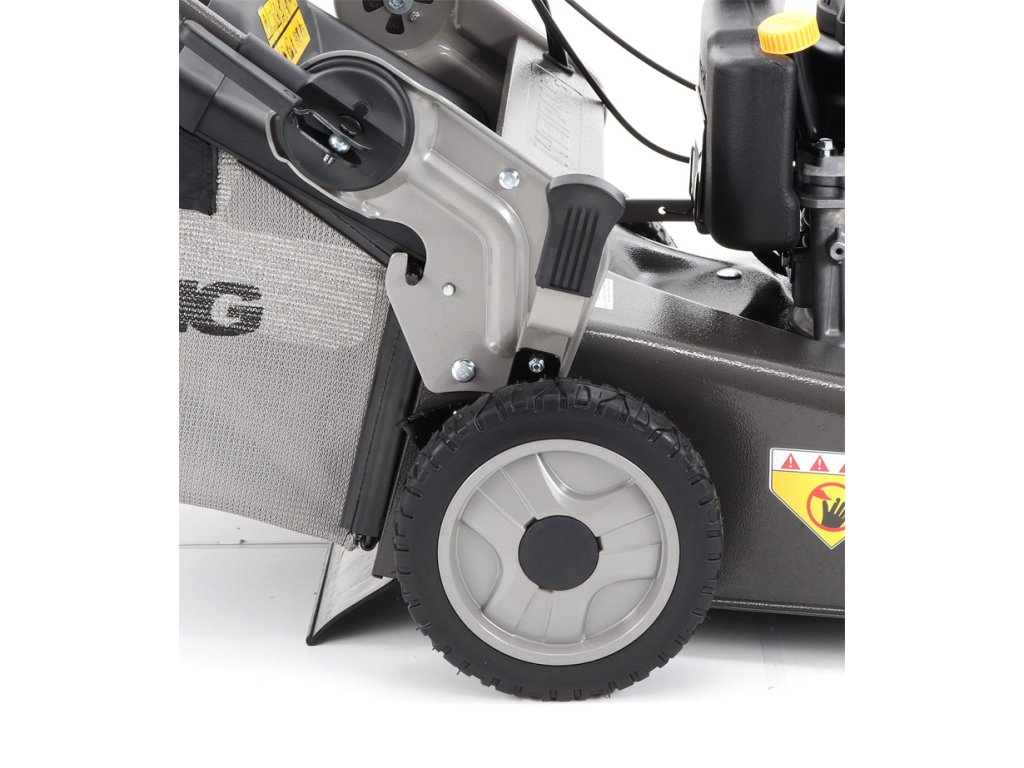 Pogumovaná sendvičová hliníková kola jsou uložena v oboustranných kuličkových ložiscích, centrální nastavení výšky sečení je u této značky samozřejmostí. Velkým nadstandardem u této sekačky je použita speciální třecí spojka na noži sekačky pod unášečem,