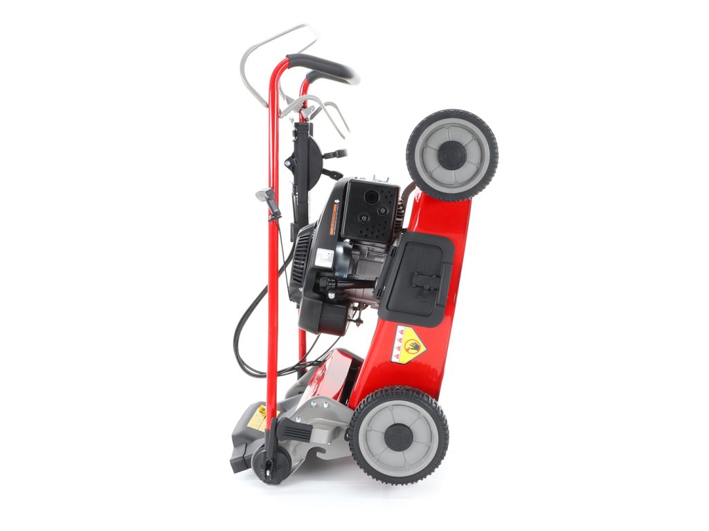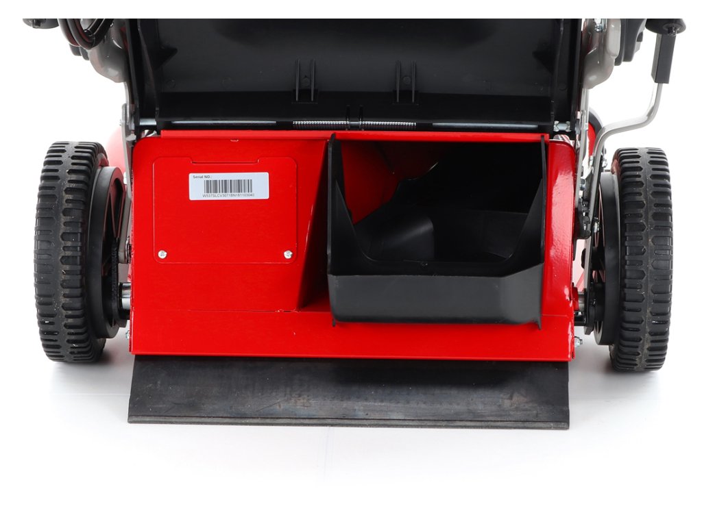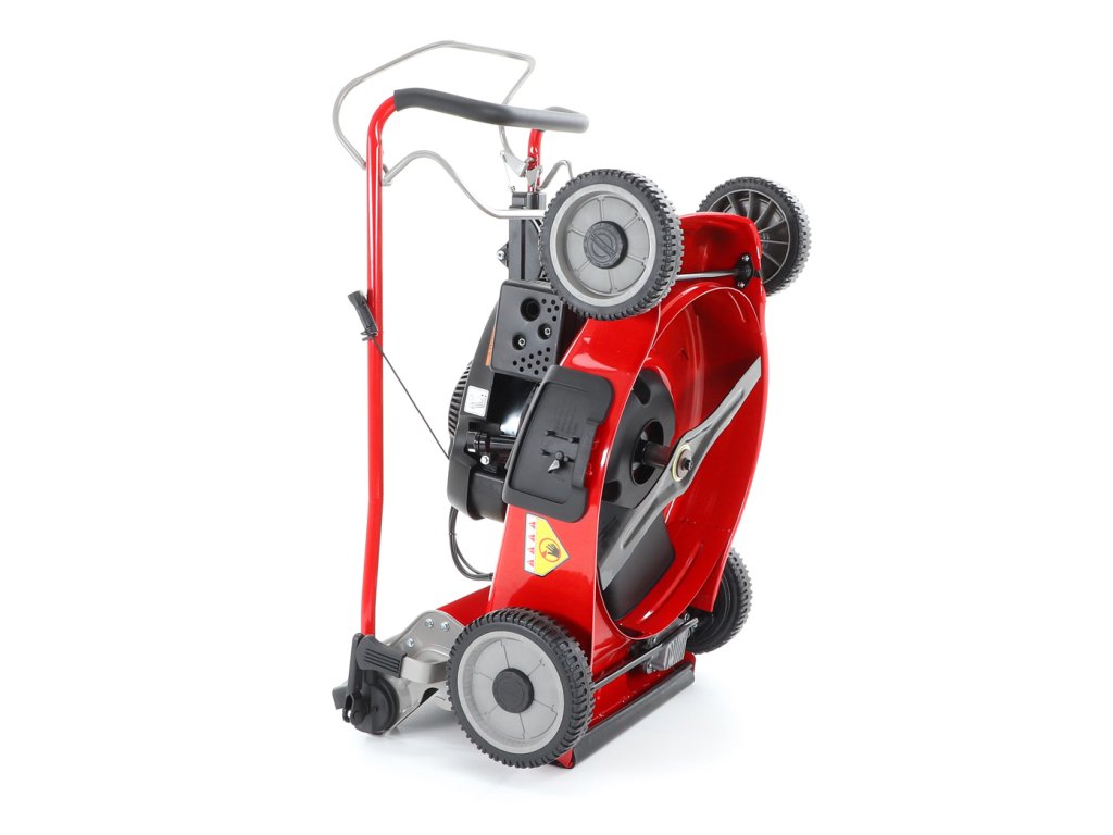 Novinkou sekačky je funkce tzv. "CHYTRÉ ŘEŠENÍ", sekačku lze pro ekonomické uskladnění, snadné čištění, servisování otočit a postavit na zadní speciální patky šasí, tímto se snadno dostanete na spodní část žacího ústrojí, uložení náprav a převodovku.